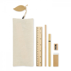 Artikel-Nr: OCBMO2916-03Schreibset. Etui aus Jute- und Baumwolle. Holzlineal 15cm, Holzbleistift, Kugelschreiber mit Papierschaft, Spitzer und Radierer.