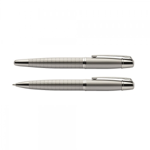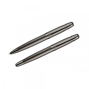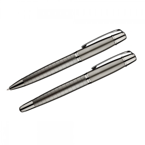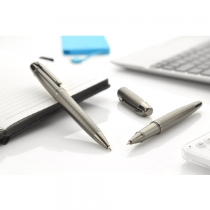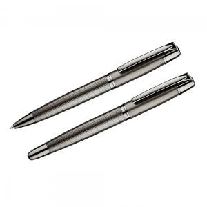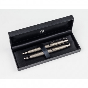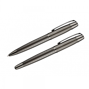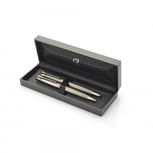 Artikel-Nr: ARD19582Elegantes Set renomierter Marke GESSTOR, deren Produkte durch hohe Qualität und einzigartiges Design gekennzeichnet sind. Die schwarze Box enthält einen Kugelschreiber und Tintenroller in Graphit-Farbe. Beide Komponenten wurden im Ganzen aus Metall hergestellt und das untere Teil eine interessante Gitter-Oberflächenstruktur aufweist. Auf den Enden der Schreibgeräte befindet sich Kennzeichnung der Marke Gesstor. Kennzeichnung kann auf den Stiften und der Box angebracht werden.