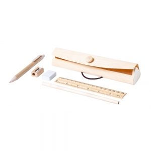 Artikel-Nr: AND7220555-teiliges Schreibset aus Holz in einem Holzstiftetui. Inklusive Kugelschreiber aus Recyclingpapier (blauschreibend), Bleistift (HB, ungespitzt), 15 cm Lineal, Anspitzer und Radiergummi.