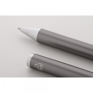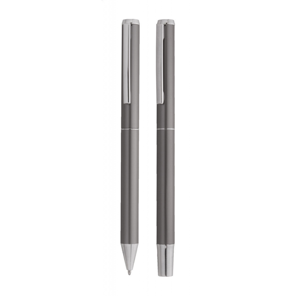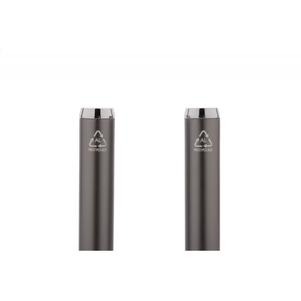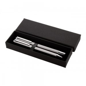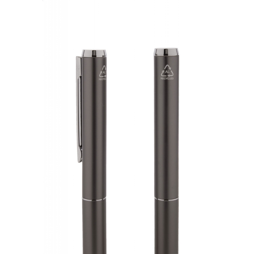Artikel-Nr: AND800499-77Schreibset aus recyceltem Aluminium, bestehend aus einem Kugelschreiber und einem Rollerball-Stift, verpackt in einer schwarzen Geschenkschachtel, blauschreibend.