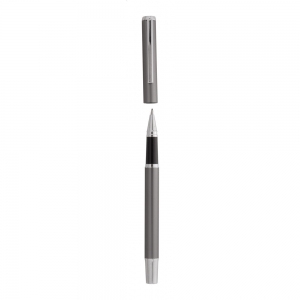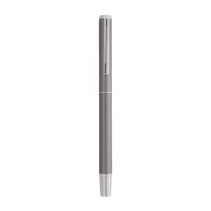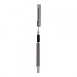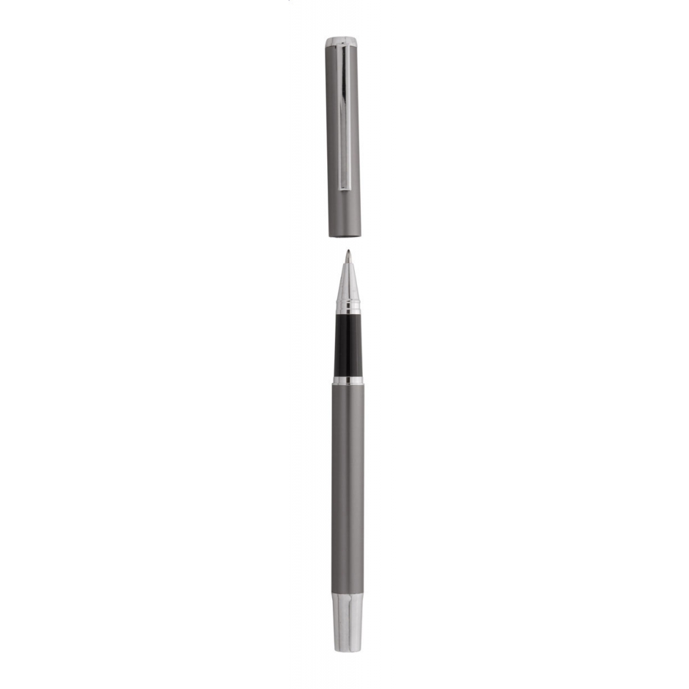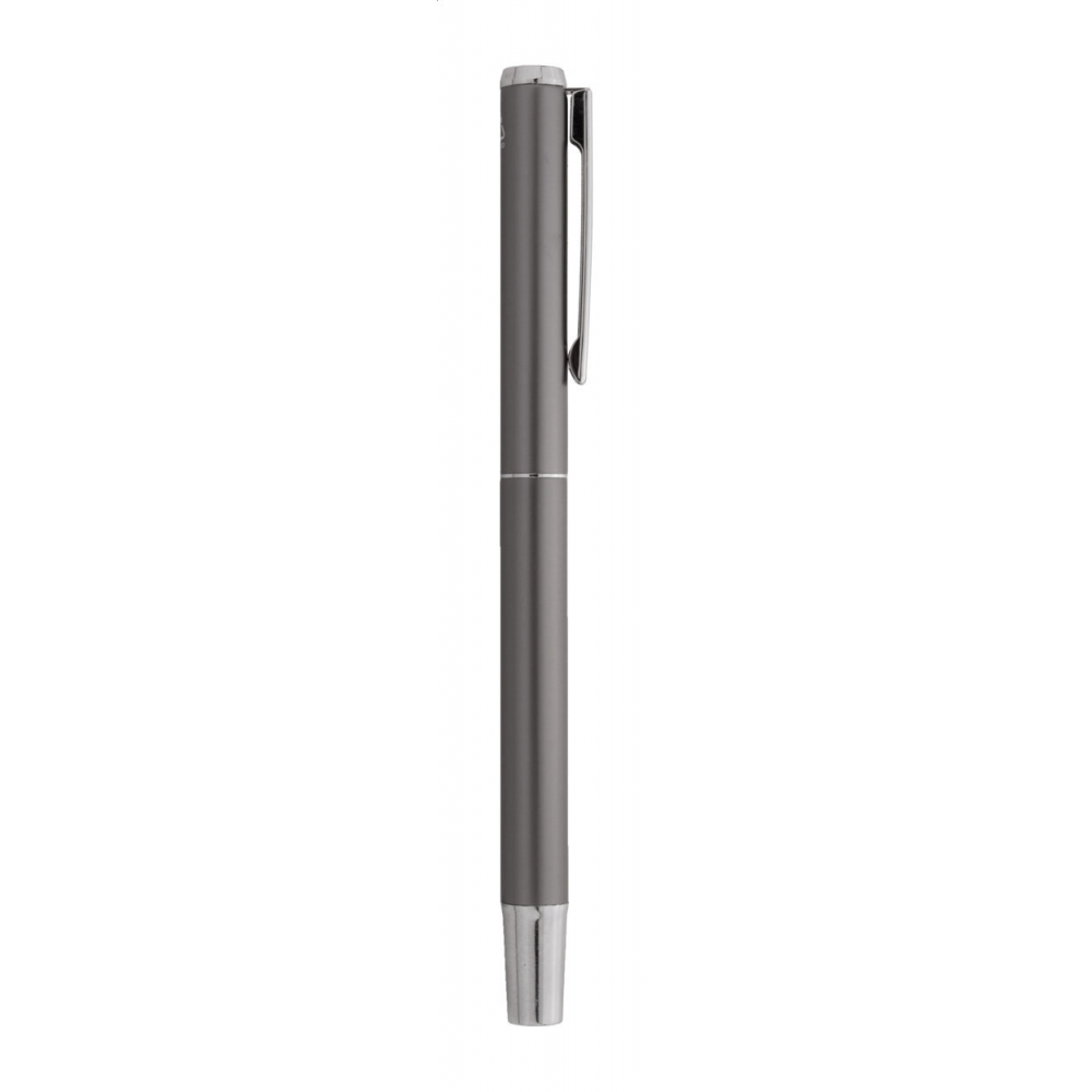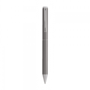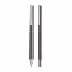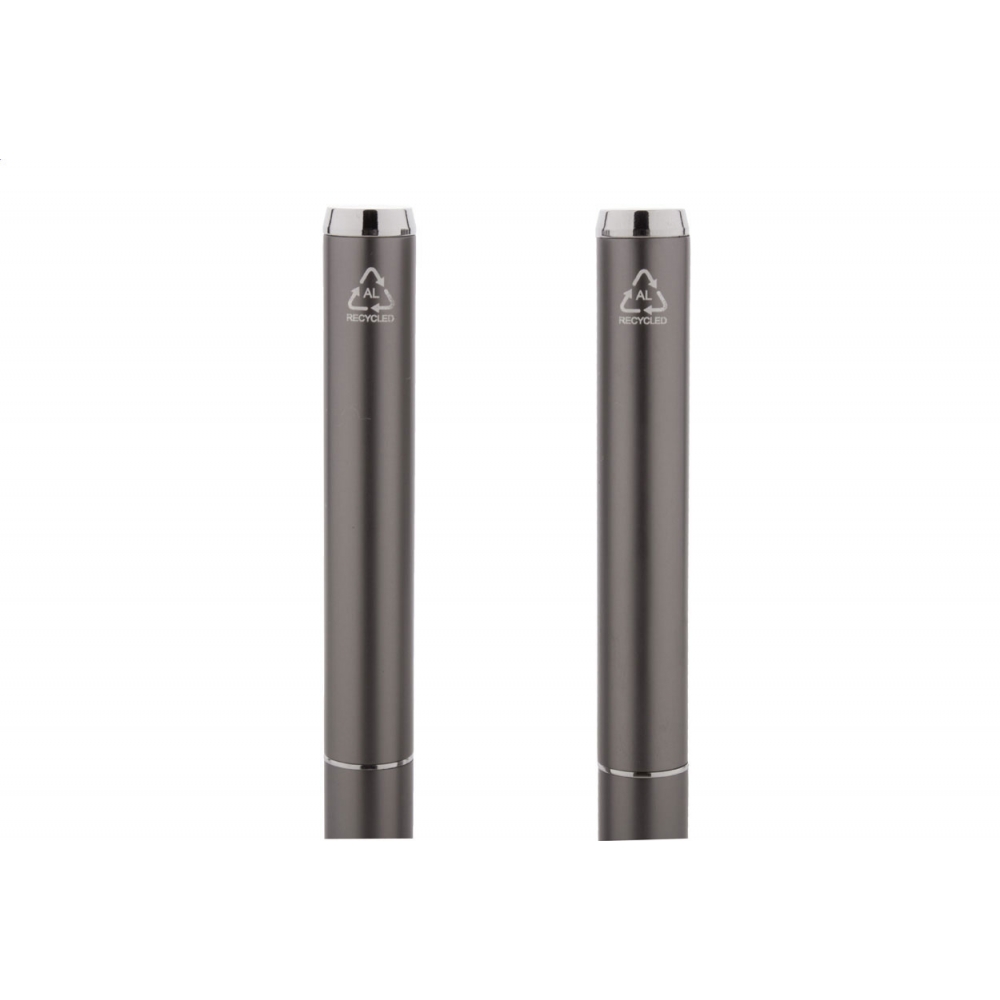 Artikel-Nr: AND800499-77Schreibset aus recyceltem Aluminium, bestehend aus einem Kugelschreiber und einem Rollerball-Stift, verpackt in einer schwarzen Geschenkschachtel, blauschreibend.