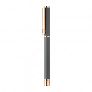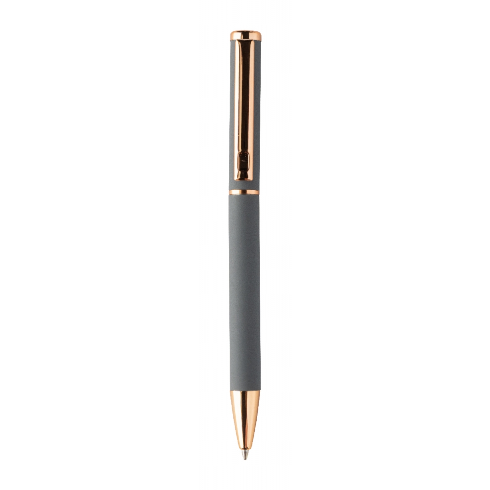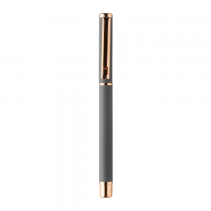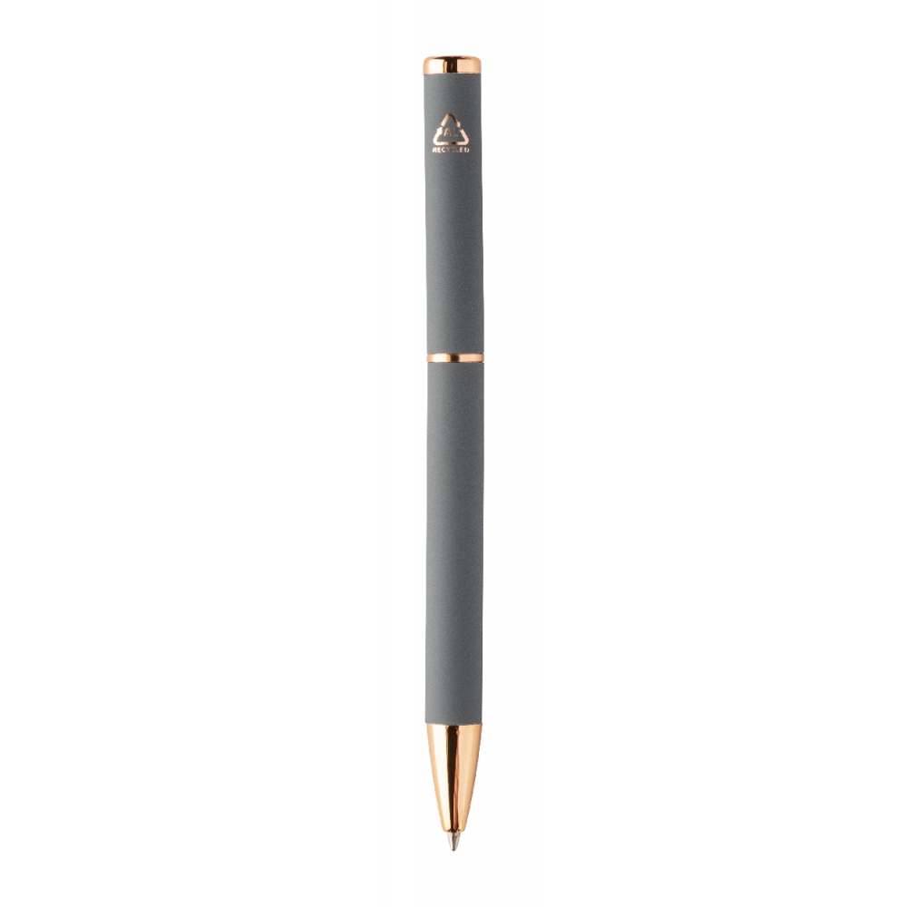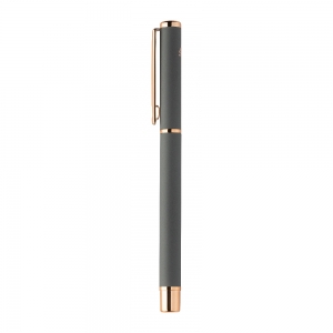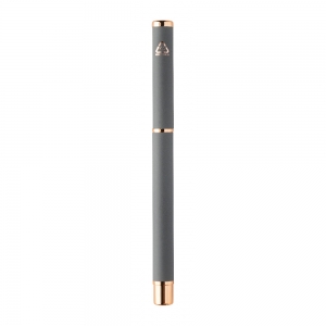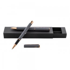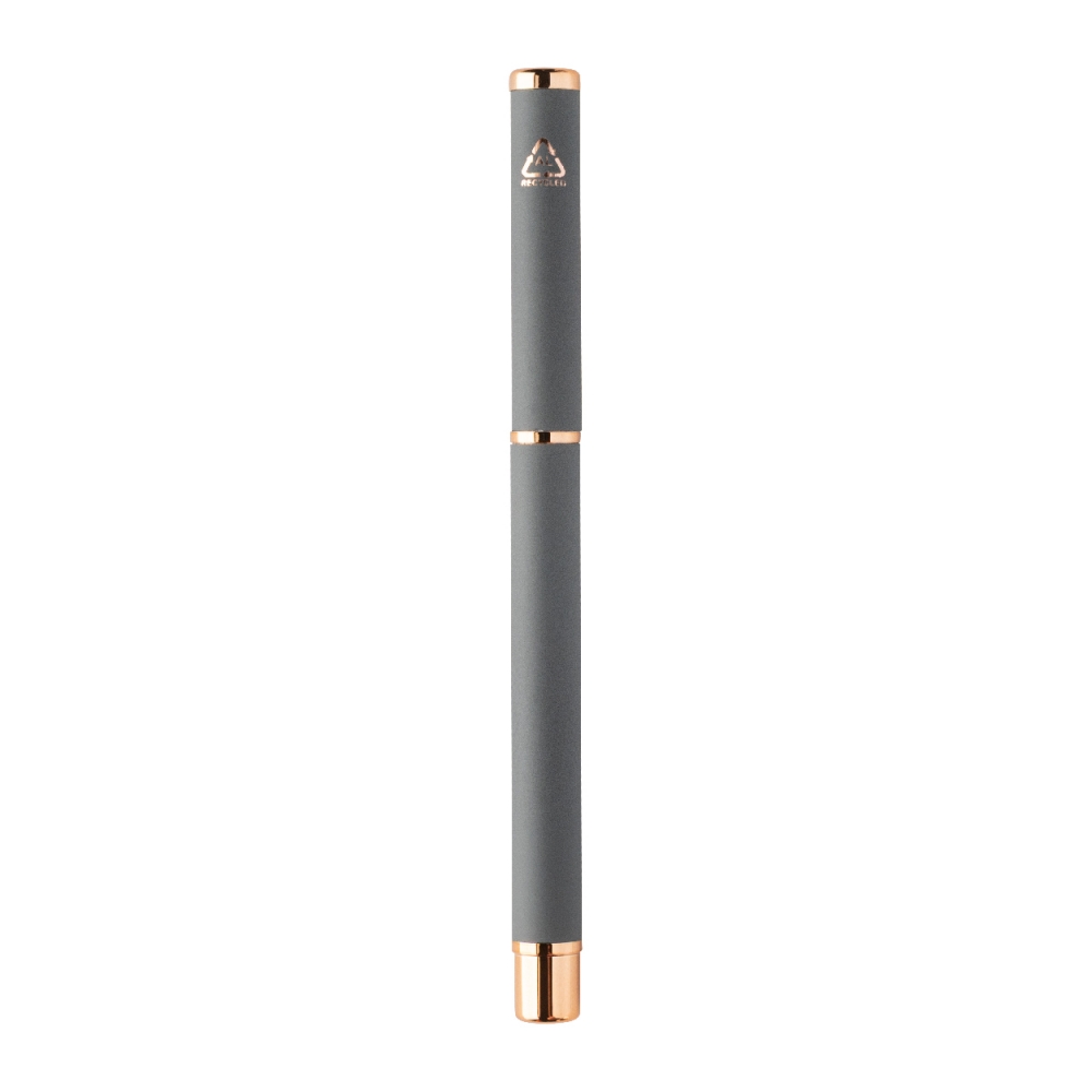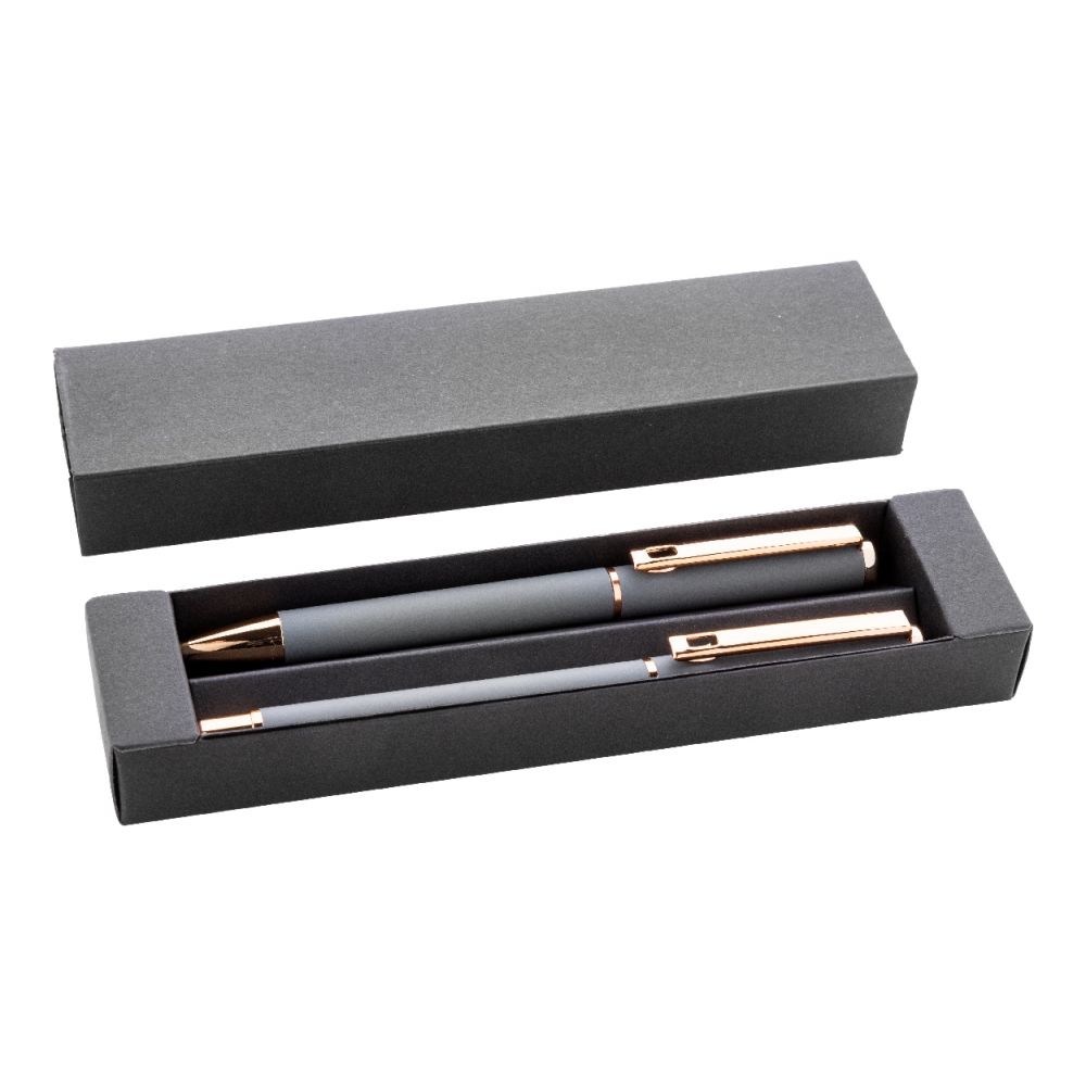 Artikel-Nr: AND808180-77Kugelschreiber- und Tintenrollerset aus recyceltem Aluminium mit gummierter Oberfläche und roségoldenen Details, blauschreibend. Mit Spezialbeschichtung für Spiegelgravur in Roségold. Einzeln in schwarzer Geschenkbox aus Papier.