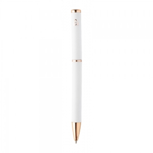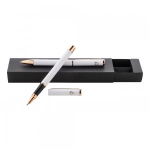 Artikel-Nr: AND808180-01Kugelschreiber- und Tintenrollerset aus recyceltem Aluminium mit gummierter Oberfläche und roségoldenen Details, blauschreibend. Mit Spezialbeschichtung für Spiegelgravur in Roségold. Einzeln in schwarzer Geschenkbox aus Papier.