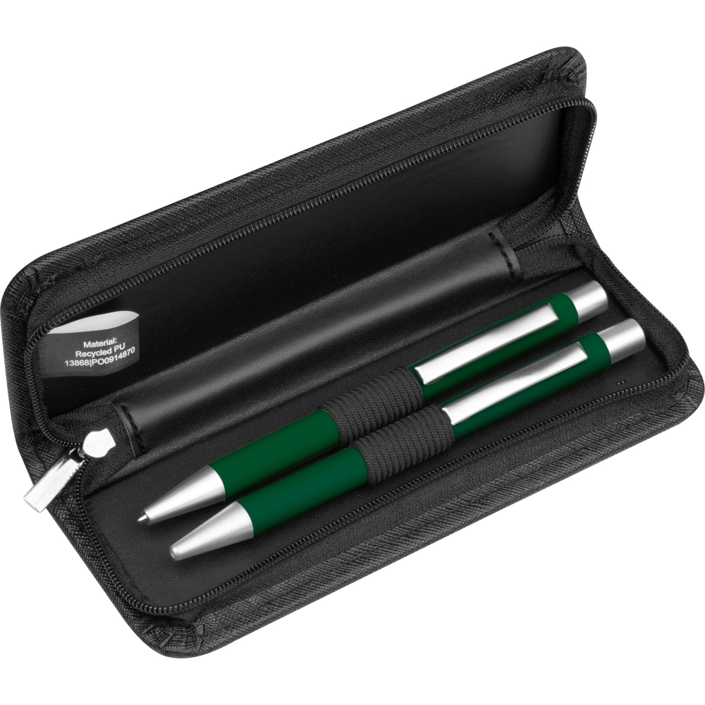 Artikel-Nr: EAG441099Schreibset bestehend aus einem blauschreibenden Aluminium Kugelschreiber mit einer Kunststoffgroßraummine und einem passenden Aluminium Druckbleistift mit zwei Bleistiftminen (0,5 mm). Beide Stifte verfügen über eine rubber finish Oberfläche die für eine angenehme Hapitk sorgt, das Etui besteht aus recyceltem PU. Ihre Werbung drucken wir auf das Etui. Gravur auf den Stiften auf Anfrage möglich.