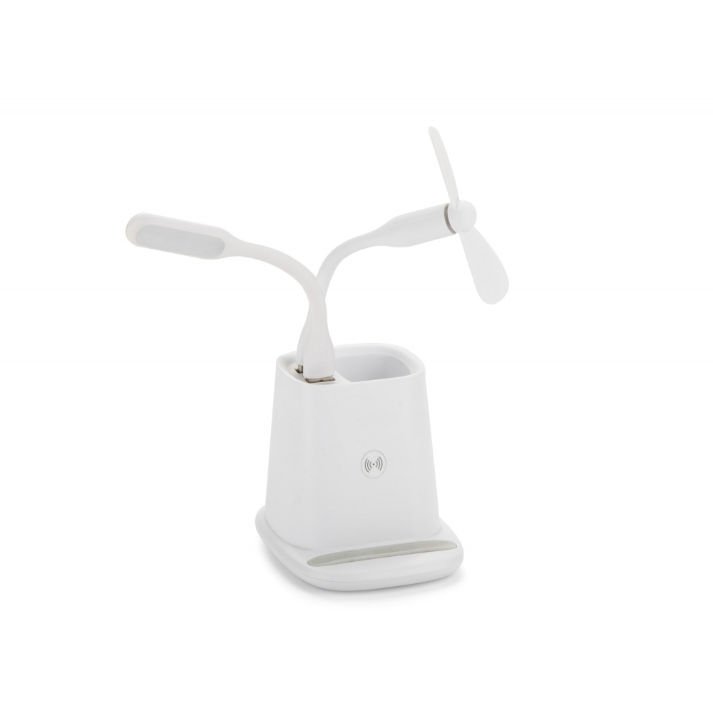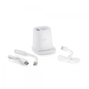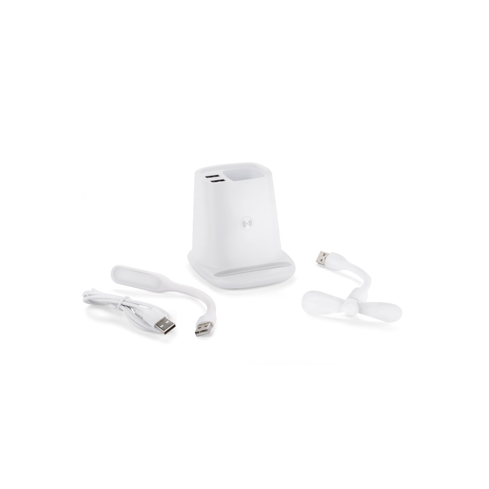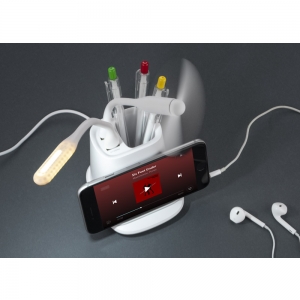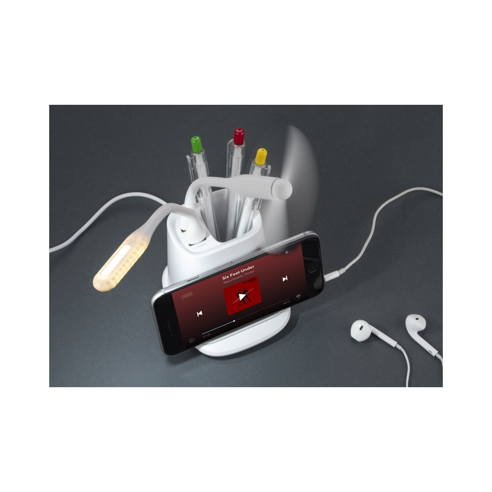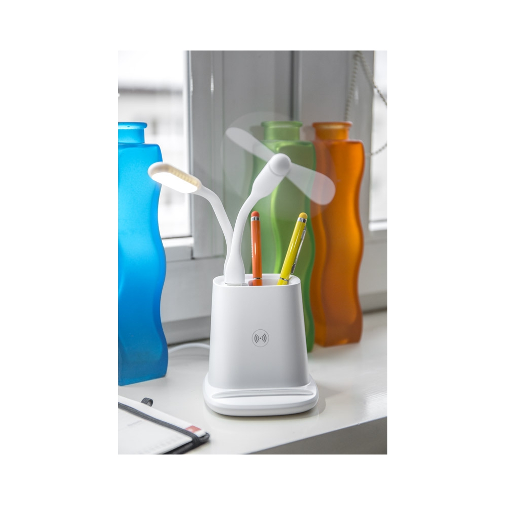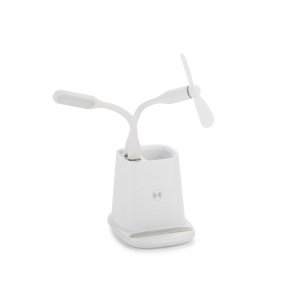 Artikel-Nr: ARD09131-01Schreibtischbehälter BERGO ist das perfekte Gadget für Arbeit am Schreibtisch. Es verfügt über ein eingebautes kabelloses Ladegerät, das auch als Telefonständer dient, und zwei USB-Anschlüsse, über die das mitgelieferte Zubehör mit Strom versorgt wird: einen Lüfter und eine Lampe. Wenn Sie kein Zubehör verwenden, können die USB-Anschlüsse als Hubs fungieren. Technische Daten: Micro-USB-Eingang: 5 V / 2A, kabelloser Ladegerätausgang: 5 W, 2 USB-Ausgänge: 5 V / 2A (max.)