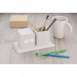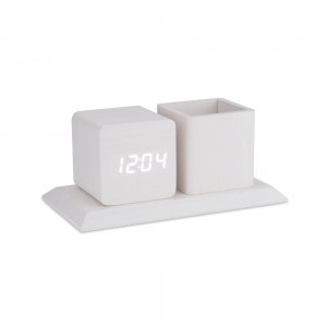 Artikel-Nr: ARD03083-01Schreibtisch-Organizer aus MDF-Platte mit einer trendigen hellen Holzoberfläche, die sich perfekt in moderne Räume einfügt. Es verfügt über einen Behälter für Stifte und eine Uhr mit Funktionen: Kalender, Alarm und Thermometer.