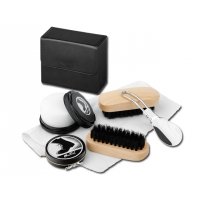 Sechsteiliges Schuhputzset im Etui aus Kunstleder.