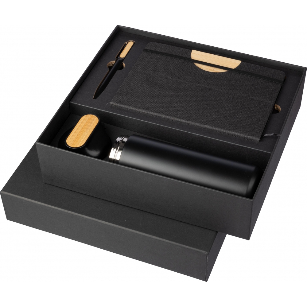 Artikel-Nr: GIV1103694001Geschenkbox aus schwarzem Karton mit 3 Artikeln: eine vakuumisolierte doppelwandige Edelstahl-Trinkflasche (640 ml) mit PP-Deckel, Silikonband und Bambus-Detail auf dem Deckel. Die Innenseite ist aus Edelstahl 304, die Außenseite aus Edelstahl 201; ein Drehkugelschreiber aus Aluminium mit mattem Finish, blauer Schrift und einem Bambus-Detail auf dem Clip; und ein Notizbuch aus rPET (300D) (ca. A5) mit 80 linierten Seiten und einem faltbaren Umschlag, der sich in einen Telefonhalter verwandeln lässt, mit einem Bambus-Detail auf dem Umschlag.