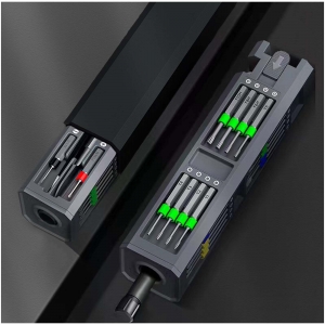Artikel-Nr: CPO2PX1709030-teiliger Präzisionsschraubendreher-Satz mit 28 Bits und zwei Zubehörteilen. Das Gehäuse aus eloxiertem Aluminium (15 x 3,6 x 3,6 cm) kann mit einem eingravierten Logo personalisiert werden. Das kompakte Gehäuse macht es einfach, alles an einem Ort aufzubewahren. Der Handschraubendreher eignet sich perfekt für die Reparatur von Kleingeräten und ist dank seiner Form leicht zu handhaben. Er verfügt über eine Vielzahl von Bits, die ihn universell für viele Arten von Heimwerkerarbeiten einsetzbar machen. Jeder Bit-Typ ist mit einer anderen Farbe gekennzeichnet, damit er leicht zu identifizieren ist. Die Bits werden magnetisch im Schraubendreher gehalten. Das Set enthält auch eine Pinzette zum Aufnehmen kleinerer Gegenstände und ein Brecheisen zum Anheben und Öffnen von Verpackungen. Verpackt in einer Geschenkbox (17 x 55 x 43,5 cm) mit Magnetverschluss. Inklusive 3 Jahre Garantie.