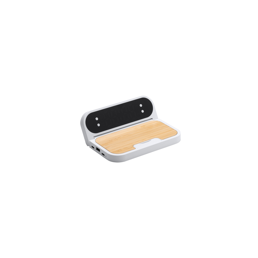 Artikel-Nr: PRM812136_13Das kabellose Ladegerät aus Bambus und ABS ist eine stilvolle und langlebige Option zum einfachen Aufladen Ihrer Geräte. Dieses Ladegerät kombiniert die natürliche Schönheit von Bambus mit der Kraft von recyceltem ABS und bietet so eine umweltfreundliche Lösung. Neben der kabellosen 10-W-Ladefunktion verfügt dieses Ladegerät auch über eine Uhrfunktion. Sie können damit die aktuelle Uhrzeit anzeigen und Alarme nach Ihren Bedürfnissen einstellen. Deshalb haben Sie nicht nur ein praktisches Ladegerät, sondern auch eine funktionale Uhr. Der Typ-C-Ladeanschluss sorgt für eine schnelle und effiziente Stromübertragung zu Ihren kompatiblen Geräten. Darüber hinaus ist ein Kabel zum einfachen Anschließen und Laden im Lieferumfang enthalten.