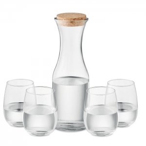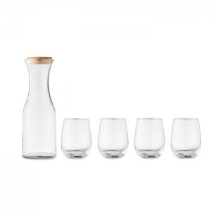 Artikel-Nr: OCBMO6656-22Getränke-Set aus recyceltem Glas. Enthält eine Karaffe (1L) mit Verschluss aus Kork und 4 Gläser (420 ml je Glas). Kork ist ein 100% natürliches Material. Aufgrund seiner strukturellen Beschaffenheit und Oberflächenporosität kann das endgültige Druckergebnis pro Artikel Abweichungen aufweisen.