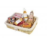 Artikel-Nr: 7980026Set mit einem Stück Gourmet-Bauernschinken, ca. 500 g,einer Salami 1a, weiß 300 g, je einem Stück Teutoburger Sommerwurst ca. 400 g - im Tuch gereift - und einem Stück 'Börde Speck', Käse-Spezialität, Gauda ohne Rinde,ca. 250 g. Dazu ein Glas grobe Leberwurst, ca. 250 g, Spitzenqualität, ein Paket westf. Pumpernickel, Haverland 500 g, Roggenvollkornschrotbrot. In einem Seegraskorb, ausgeschlagen mit Stoff und im Umkarton bruchsicher und versandfertig verpackt.