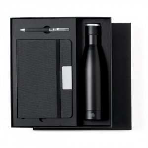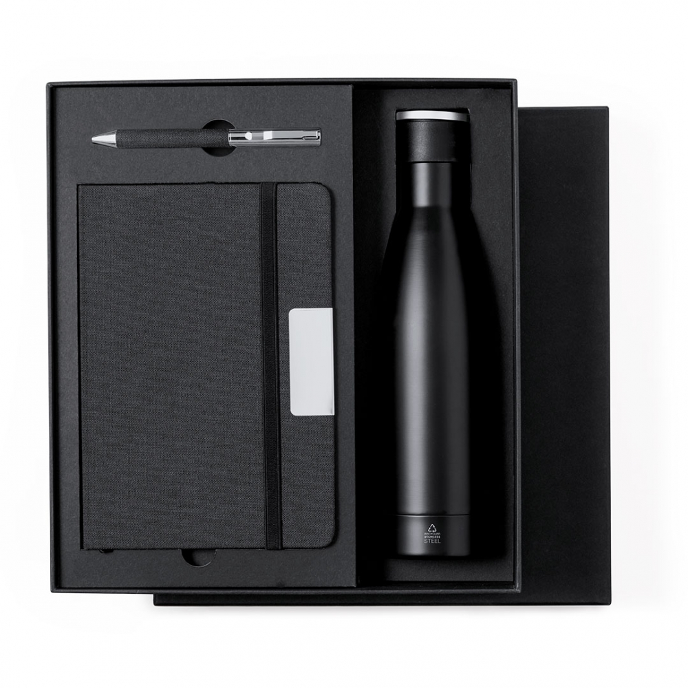 Artikel-Nr: KTO21122002000Elegantes Premium-Set, bestehend aus:Doppelwandige Thermoskanne aus recyceltem Edelstahl mit mattschwarzer Oberfläche und 500 ml Fassungsvermögen, mit stabilem, matt-silbernem Metallgriff. Mit Embleem für rostfreiem Stahl. RPET-Notizblock in elegantem Schwarz mit speziellen Metalldetails für die Laserbeschriftung. Mit elastischem Verschluss und Lesezeichen aus Stoff. Innen mit 80 linierten Blättern. Mit RPET-Logo. RPET-Kugelschreiber mit mattschwarzem Finish, Drehmechanismus und blauer Tinte. Mit Clip und Spitze aus poliertem Metall. Das Set wird in einem individuellen matten Etui präsentiert, mit einer Innenstanzung für jedes Element des Sets. Das RPET-Material wird aus recyceltem Kunststoff hergestellt, um die Wiederverwendung von Kunststoffabfällen zu fördern und die Nachhaltigkeit unseres Planeten zu unterstützen.