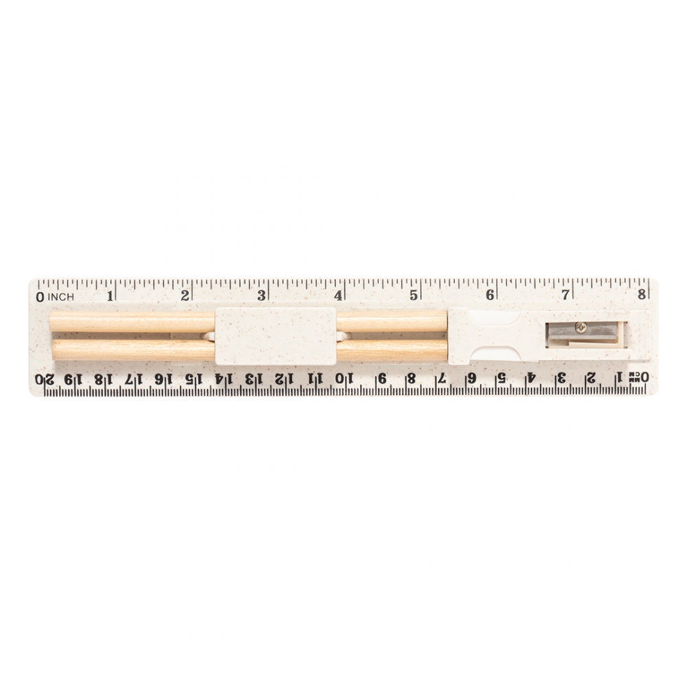 Artikel-Nr: KTO203800130005-teiliges Set aus Weizenstroh. Inklusive 2 Holzstifte mit schwarzer Mine und weißem zylindrischen Körper; Radiergummi, und Spitzer. Präsentiert in einem Etui mit Lineal von 20 cm/8 Zoll, mit Fächern für die verschiedenen Elemente des Sets. Einzeln verpackt in einer weißen Papiertüte. Weizenstroh fördert die Verwendung von natürlichen Rohstoffen und reduziert so den Schadstoffausstoß.
