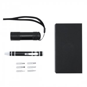 Artikel-Nr: KTO21671002000Multifunktionswerkzeugsatz mit Taschenlampe und Schraubendreher aus Aluminium. Beinhaltet:- Schraubendreher mit 6 magnetischen Köpfen: 3 flache und 3 sternförmige, ausgestattet mit einem praktischen Metallclip, der das Einhaken und den Transport erleichtert.- LED-Taschenlampe mit 9 LEDs, betrieben von 3 AAA-Batterien (nicht enthalten). Inklusive Handgelenkband, bietet Komfort und Sicherheit beim Handhaben. In schwarzer Box präsentiert.