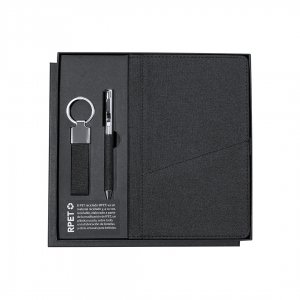 Artikel-Nr: KTO21737002000Elegantes Premium-Set, das enthält:Notizblock aus RPET in elegantem Schwarz. Einschließlich elastischem Verschluss, Fronttasche und Stoff-Lesezeichen. Innen mit 80 Blättern im linierten Format. Kugelschreiber aus RPET mit mattem Schwarz-Finish, mit Drehmechanismus und blauer Tinte. Mit Clip und polierter Metallspitze. Eleganter Schlüsselanhänger mit Band aus 300D RPET-Polyester und verchromten Zubehör. Set präsentiert in einer individuellen Schachtel mit Matt-Oberfläche, mit Innenschnitt für jedes Element des Sets und RPET-Karte im Inneren. Das RPET-Material wird aus recyceltem Plastik hergestellt, um die Wiederverwendung von Plastikabfällen zu fördern und zur Nachhaltigkeit des Planeten beizutragen.