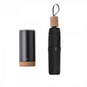 Artikel-Nr: KTO21121002000Stilvolles Premium-Set. Im Lieferumfang enthalten: Thermosbecher aus recyceltem Edelstahl mit Doppelwand und 550 ml Fassungsvermögen, in elegantem mattschwarzem Finish. Korkboden, mit Stülpdeckel und Spender. Es ist ideal für Ihren Schreibtisch, Tisch oder jede andere Oberfläche, auf der Sie in Ruhe Ihr Lieblingsgetränk genießen können. Faltbarer schwarzer Regenschirm mit 98 cm Durchmesser. Aus 190T RPET-Pongee-Material und mit Korkgriff. Manuelle Öffnung, mit winddichtem Mechanismus und Glasfaserrippen. Mit markantem RPET-Label. Das Set wird in einer individuellen matten Hülle geliefert und verfügt über eine Innenstanzung für jedes Element des Sets. Das RPET-Material wird aus recyceltem Kunststoff hergestellt, was die Wiederverwendung von Kunststoffabfällen fördert und zur Nachhaltigkeit des Planeten beiträgt.