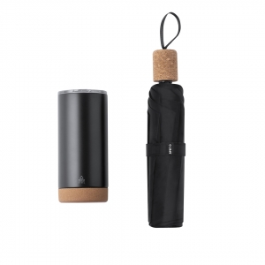 Artikel-Nr: KTO21121002000Stilvolles Premium-Set. Im Lieferumfang enthalten: Thermosbecher aus recyceltem Edelstahl mit Doppelwand und 550 ml Fassungsvermögen, in elegantem mattschwarzem Finish. Korkboden, mit Stülpdeckel und Spender. Es ist ideal für Ihren Schreibtisch, Tisch oder jede andere Oberfläche, auf der Sie in Ruhe Ihr Lieblingsgetränk genießen können. Faltbarer schwarzer Regenschirm mit 98 cm Durchmesser. Aus 190T RPET-Pongee-Material und mit Korkgriff. Manuelle Öffnung, mit winddichtem Mechanismus und Glasfaserrippen. Mit markantem RPET-Label. Das Set wird in einer individuellen matten Hülle geliefert und verfügt über eine Innenstanzung für jedes Element des Sets. Das RPET-Material wird aus recyceltem Kunststoff hergestellt, was die Wiederverwendung von Kunststoffabfällen fördert und zur Nachhaltigkeit des Planeten beiträgt.