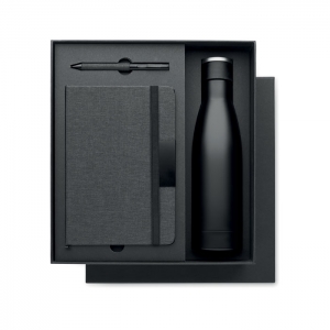 Artikel-Nr: OCBMO2162-03Elegantes 3teiliges Geschenk-Set: DIN A5 Notizbuch mit gebundenem Hard Cover aus RPET. 80 Blatt ( 160 Seiten) liniertes Recyclingpapier. Elastisches Verschlussband, Stiftschlaufe und Lesebändchen. Passender Drehkugelschreiber. Doppelwandige Isolierflasche aus Edelstahl. Füllmenge: 500 ml. Lieferung in Geschenkbox. FSC®-certified | FSC MIX CREDIT, P7.1, FSC-C213206