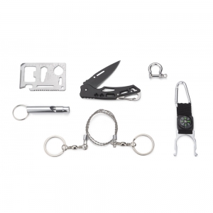 Artikel-Nr: ARD20039Das BALE Outdoor--Set ist ein Genuss für Survival-Liebhaber. In einem Set finden Sie alles, was auf vielen Reisen nützlich sein kann. Das Set besteht aus sechs Elementen: einem Flaschenhalter mit Karabiner und Kompass, einer manuellen Handkettensäge, einem Klappmesser, einer Pfeife, einem Segelschäkel und einer Überlebenskarte mit bis zu 11 Funktionen: Dosenöffner, Flaschenöffner, Schraubendreher, 4 cm Lineal, 4-Positionen-Schlüssel für verschiedene Schraubengrößen, zweireihige Säge, Zwei-PositionenSchraubenschlüssel und Lanyard- oder Schlüsselringloch. Das Set ist in einem schwarzen Etui verpackt.