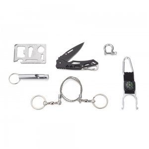 Artikel-Nr: ARD20039Das BALE Outdoor--Set ist ein Genuss für Survival-Liebhaber. In einem Set finden Sie alles, was auf vielen Reisen nützlich sein kann. Das Set besteht aus sechs Elementen: einem Flaschenhalter mit Karabiner und Kompass, einer manuellen Handkettensäge, einem Klappmesser, einer Pfeife, einem Segelschäkel und einer Überlebenskarte mit bis zu 11 Funktionen: Dosenöffner, Flaschenöffner, Schraubendreher, 4 cm Lineal, 4-Positionen-Schlüssel für verschiedene Schraubengrößen, zweireihige Säge, Zwei-PositionenSchraubenschlüssel und Lanyard- oder Schlüsselringloch. Das Set ist in einem schwarzen Etui verpackt.
