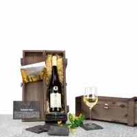 Bestehend aus 1 Flasche prämiertem Riesling 0,75 l, mit 4 Glasuntersetzern aus Schiefer und Gedanken zum Thema 'Schiefer', in dunkelbrauner Holzbox