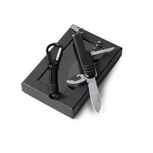 Artikel-Nr: KTO13484002000Set aus Multifunktions-Taschenmesser mit 7 Funktionen sowie Taschenlampe mit Karabiner - mit Aluminiumgehäuse in verschiedenen Farben. Präsentiert in einer individuellen Box mit Fenster, ausgepolstert mit Schaum. Knopfzellen inklusive.