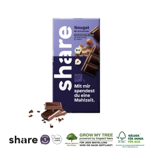 Artikel-Nr: CDL91090Jede Tafel spendet eine Mahlzeit! Leckere Nougat-Schokolade kann nicht vegan sein? Und ob! Die vegane Bio-Schokolade von share schmeckt zartbitter-nussig, zerfließt auf deiner Zunge und hinterlässt den typisch nussigen Schokoladengeschmack mit Suchtfaktor. In der Schweiz hergestellt hat die share Schokolade beste Bio-Qualität. Lasst uns die Welt jeden Tag ein Stück gerechter machen: Jede Tafel spendet eine Mahlzeit an einen Menschen in Not.