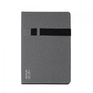 Artikel-Nr: PRM850605_15A5-Notizbuch mit RPET-Hardcover. Inklusive Stift- und Handyhalter. 80 leere Blätter.