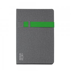 Artikel-Nr: PRM850605_04A5-Notizbuch mit RPET-Hardcover. Inklusive Stift- und Handyhalter. 80 leere Blätter.