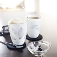 Artikel-Nr: 5111000028158Thermobecher-Set: 2 Thermobecher weiß (25 cl, H: 11,5 cm) mit Dekor, 2 langstielige Edelstahllöffel, 2 Filzuntersetzer (Ø 9 cm), 1 Glasschale für Zucker oder Gebäck, 2 Zuckerpyramiden weiß, 2 Zuckerpyramiden schwarz. Inklusive Rezeptblatt.