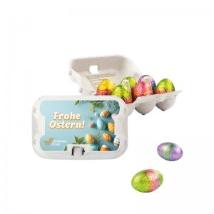 Artikel-Nr: PUC1078.00001Schoko Ostereier im Eierkarton mit Papieretikett, individuell bedruckt. Inhalt: 6 Klett Schoko Ostereier aus feinster Vollmilchschokolade in bunter Alufolie, 37,5 g Saisonartikel - solange der Vorrat reicht!