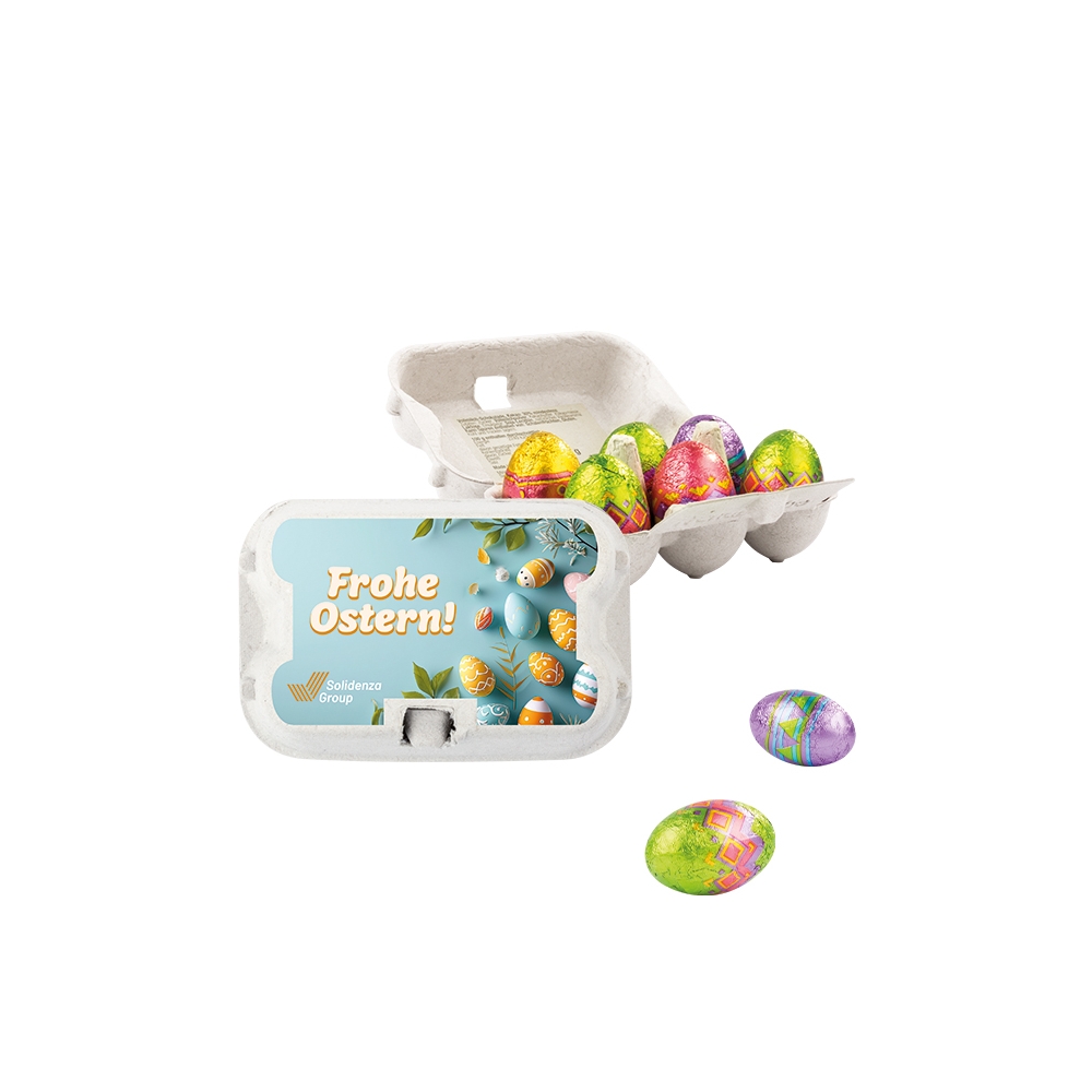 Artikel-Nr: PUC1078.00001Schoko Ostereier im Eierkarton mit Papieretikett, individuell bedruckt. Inhalt: 6 Klett Schoko Ostereier aus feinster Vollmilchschokolade in bunter Alufolie, 37,5 g Saisonartikel - solange der Vorrat reicht!