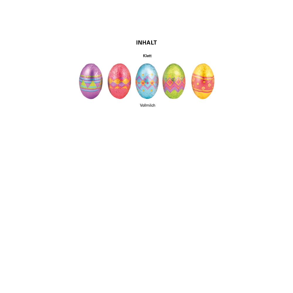 Ausführung: Material: Eierkarton mit Papieretikett, Füllung: 6 Klett Schoko Ostereier