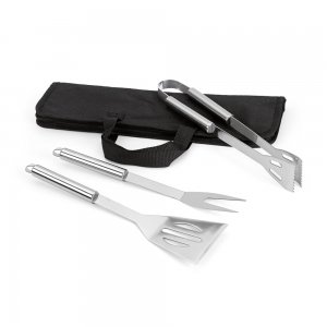 Artikel-Nr: PST93998-103Grill - Set aus Edelstahl 3-teilig bestehend aus einer Grillzange, einer Grillgabel und einem Pfannenwender. Geliefert in einer Tasche aus Non Woven. Tasche: 405 x 120 x 25 mm