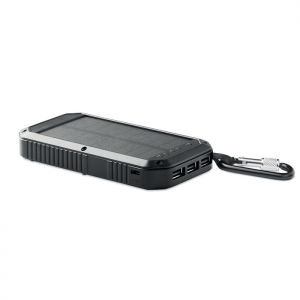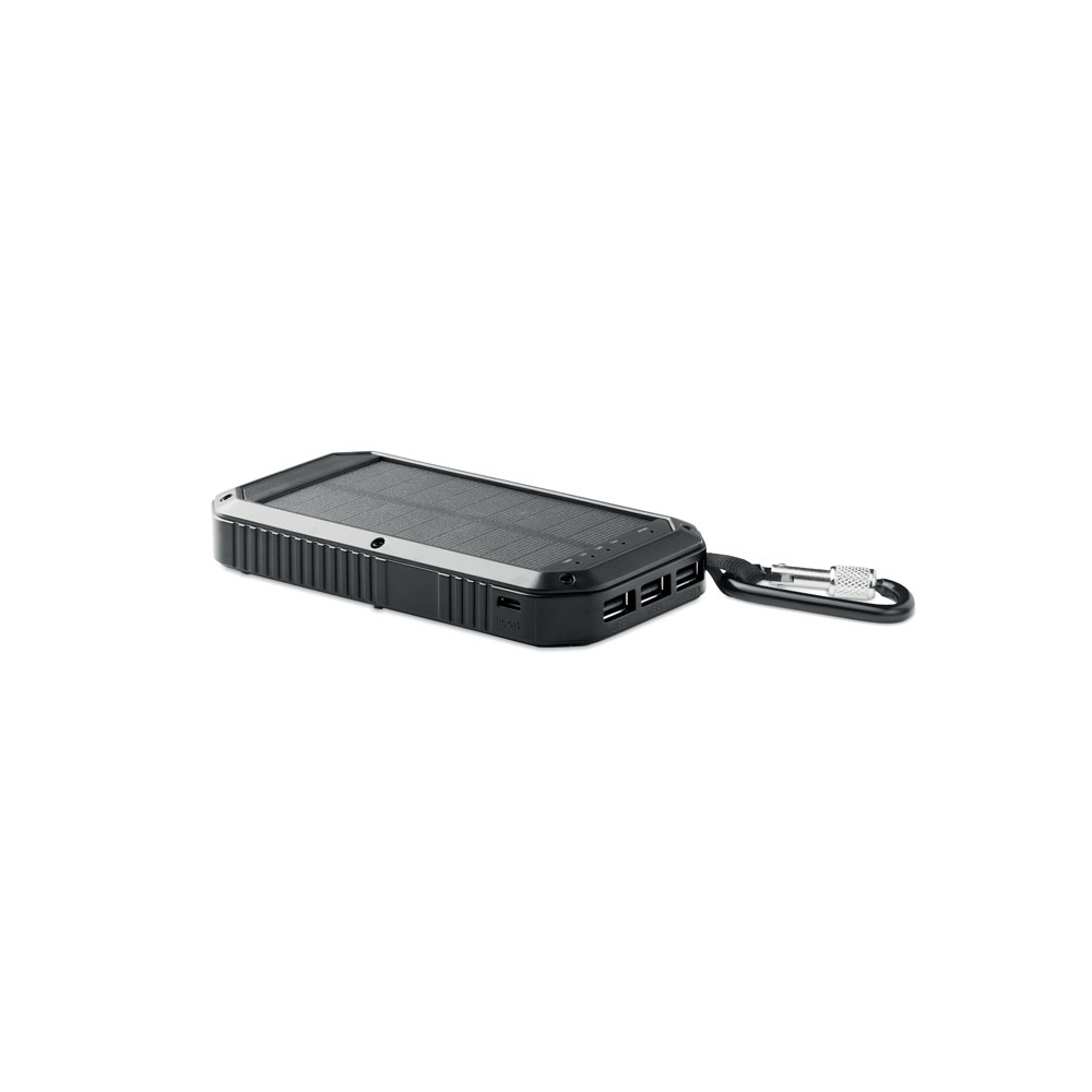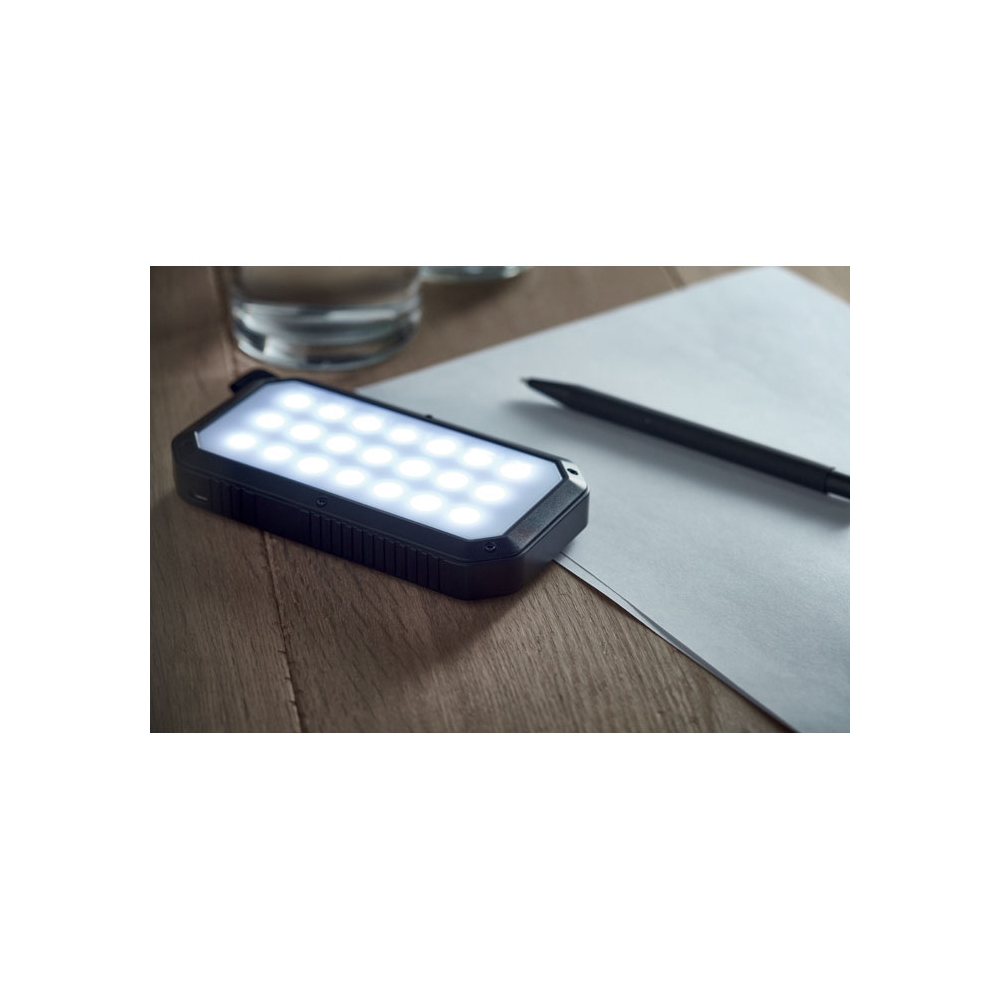 Artikel-Nr: OCBMO6424-03Powerbank 8000 mAh mit Solarzellen. Lichtfunktion mit 21 LED- Leuchten. USB-Kabel mit Mikro-USB-Stecker und Karabinerhaken. Ausgangsstrom DC5V/1A und DC5V/2A.