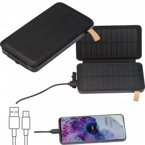 Artikel-Nr: MCM3365703Solarpowerbank aus PU mit aufklappbarem Cover (zweite Solarplatte), Hängeschlaufe, Licht, Ladekabel und 8.000 mAH Leistung. Aufladezeit: 12-15h. Ihre Werbung wird auf das Cover gedruckt.