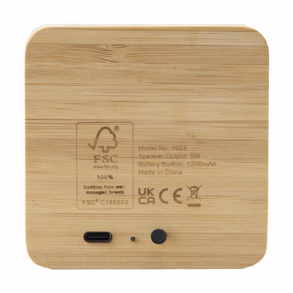 Artikel-Nr: CLP102344Kabelloser 5-W-Bluetooth-Lautsprecher. Das Gehäuse ist aus natürlichem, FSC® zertifiziertem Bambus gefertigt und ist mit einem Lautsprechertuch aus RPET ausgestattet. Mit einer Leistung von 5 W erzeugt der Lautsprecher einen guten, klaren Klang. Der eingebaute, wiederaufladbare 1200-mAh-Li-Ion-Akku garantiert nach dem Aufladen eine Spielzeit von bis zu 6 Stunden (bei einer Lautstärke von 75 %). Kabellose Reichweite bis zu 10 Meter. Einfach zu bedienen und mit den gängigsten Smartphones und Tablets kompatibel. Ausgang: 5 W. Inklusive Ladekabel mit USB-C-Anschluss und Gebrauchsanweisung. Wird einzeln in einem Kraftkarton geliefert.