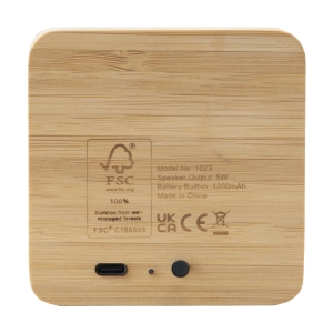 Artikel-Nr: CLP261023-823Kabelloser 5-W-Bluetooth-Lautsprecher. Das Gehäuse ist aus natürlichem, FSC 100% zertifiziertem Bambus gefertigt und ist mit einem Lautsprechertuch aus RPET ausgestattet. Mit einer Leistung von 5 W erzeugt der Lautsprecher einen guten, klaren Klang. Der eingebaute, wiederaufladbare 1200 mAh-Li-Ion-Akku garantiert nach dem Aufladen eine Spielzeit von bis zu 6 Stunden (bei einer Lautstärke von 75 %). Kabellose Reichweite bis zu 10 Meter. Einfach zu bedienen und mit den gängigsten Smartphones und Tablets kompatibel. Ausgang: 5 W. Inklusive USB-C-Ladekabel und Gebrauchsanweisung.
