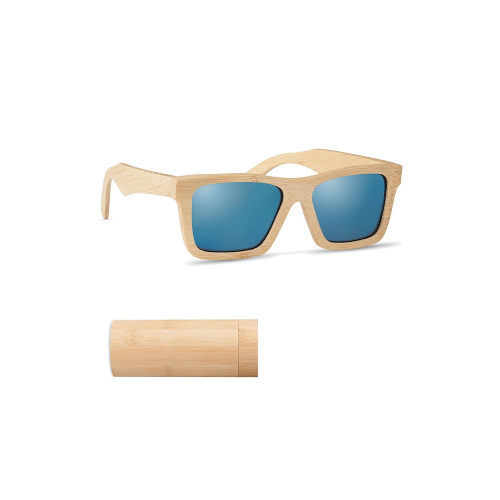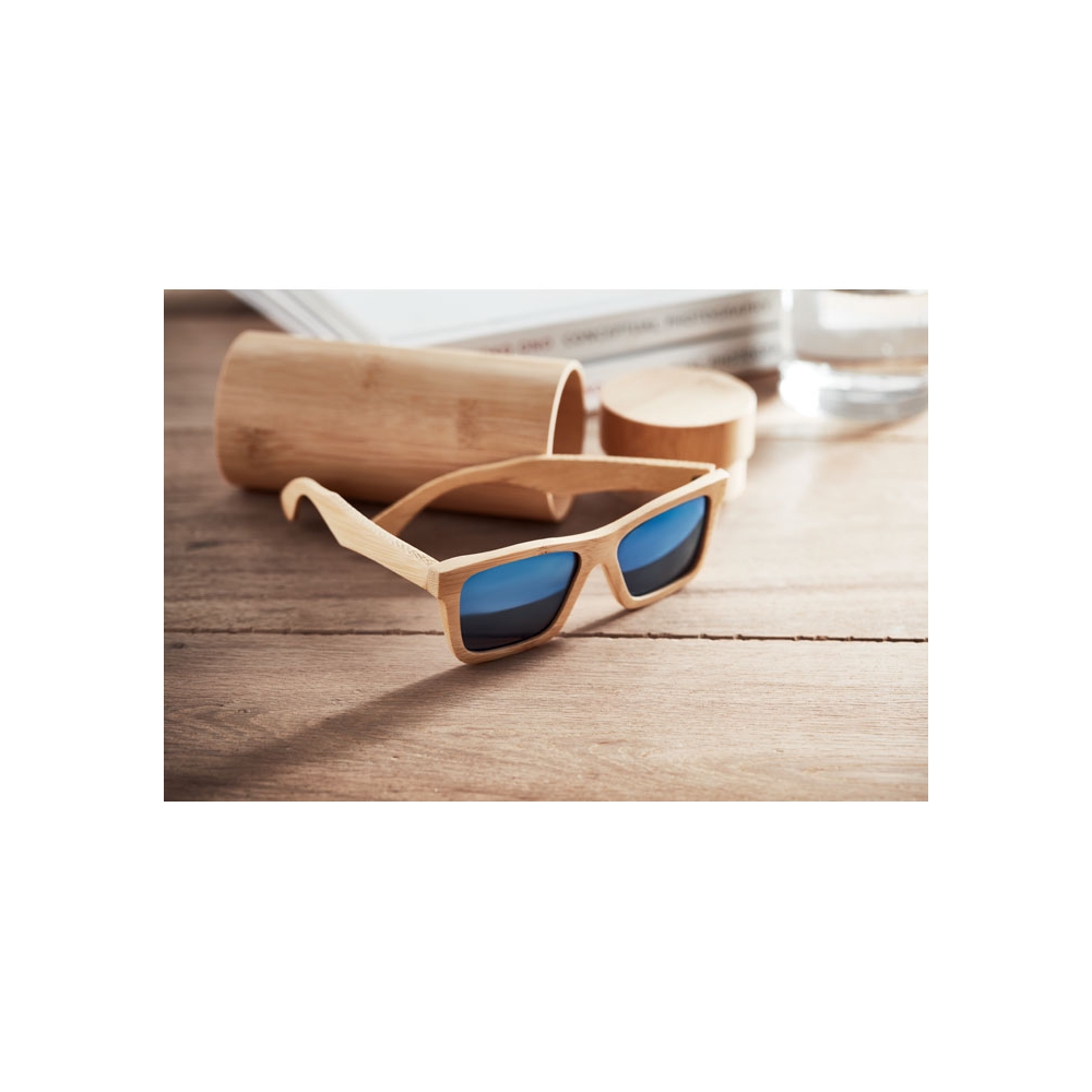 Artikel-Nr: OCBMO6454-40Sonnenbrille aus Bambus. Farbig verspiegelte Gläser. UV400-Schutz. Inkl. Brillenköcher aus Bambus. Bambus ist ein natürliches Produkt, es kann daher zu leichten Abweichungen in Farbe, Dekor und Maßen kommen.