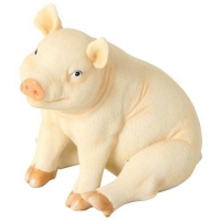 Niedliches Sparschwein aus Polyresin mit fein strukturierter, hautähnlicher Oberfläche. Wiederverschließbar nach Entleerung durch Plastikverschluß.