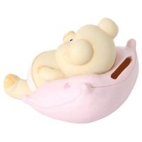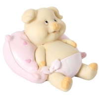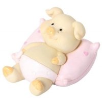 Niedliche Babyschweinchen-Spardose aus Polyresin mit hellblauem Kissen und Höschen. Wiederverschließbar nach Entleerung durch Plastikverschluß.