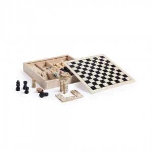 Artikel-Nr: KTO16113000000Sets aus verschiedenen Holzspielen: Mikado, Schach, Dame und Domino. Präsentiert in einer Holzkiste mit Schiebedeckel. Brett mit glatter Seite für die Personalisierung.