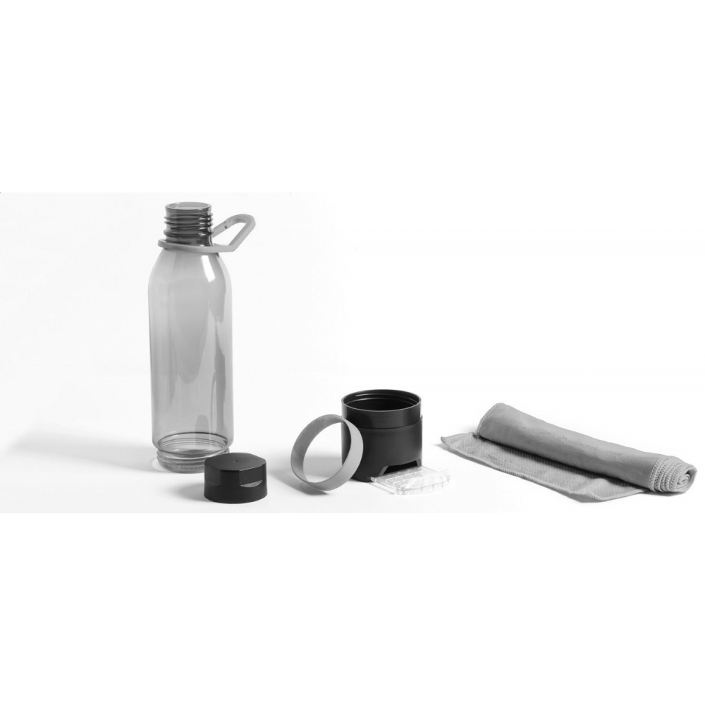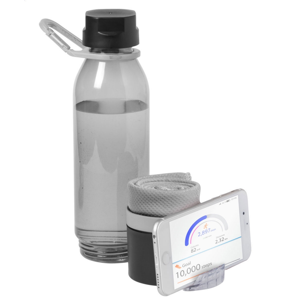 Artikel-Nr: AND781744-77Multifunktions-Sportflasche aus Kunststoff mit Kühltuch (390 g / m²) im Bodenfach und ausziehbarem Handyhalter. Im Geschenkkarton. 650 ml. Nicht für kohlensäurehaltige Getränke geeignet.