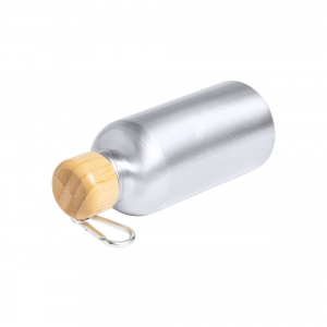 Artikel-Nr: AND722496-21Aluminium-Sportflasche mit Bambusdeckel und Karabiner, 400 ml. Nicht für kohlensäurehaltige Getränke geeignet.