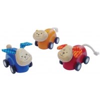 Aus Holz mit Gummireifen und Stoffohren. Der Kopf wackelt dank einer Feder auf und ab. Hund, Katze, Hase sortiert. Achtung! Nicht geeignet für Kinder unter 36 Monaten.