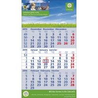 Papierwandkalender mit 3 Monaten auf einer Seite + Werbemöglichkeit auf Fußleiste, 3-sprachig (D,GB,F), dt. Feiertage