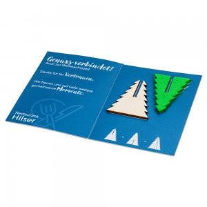 Artikel-Nr: HOP21.31896.00So klein, so charmant – und ein echtes Highlight. In der Mini-Karte stecken ein Holz- und ein Filzteil, die mit wenigen Handgriffen zu einer dekorativen Figur zusammengesetzt werden. Ein sympathischer Hingucker mit Interaktion! Die Mini-Variante gibt es als Tannenbaum oder Stern – perfekt für saisonale Grüße mit kreativem Mehrwert. Die Karte wird komplett individuell nach Ihren Wünschen gestaltet und bringt Ihre Botschaft originell und aufmerksamkeitsstark auf den Punkt.