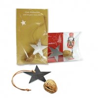 Artikel-Nr: 4012349080Der originelle Nussknacker aus Edelstahl in Sternform besticht durch seine Funktionalität und sein edles Design. Der Stern mit Lederband steckt in einer Walnuss und ist in einer transparenten Hülle mit individuell gestaltetem Einleger verpackt. Einfach drehen und die härteste Nuss ist geknackt! Größe: 7 x 7 cm, Verpackung 11,5 x 20 cm