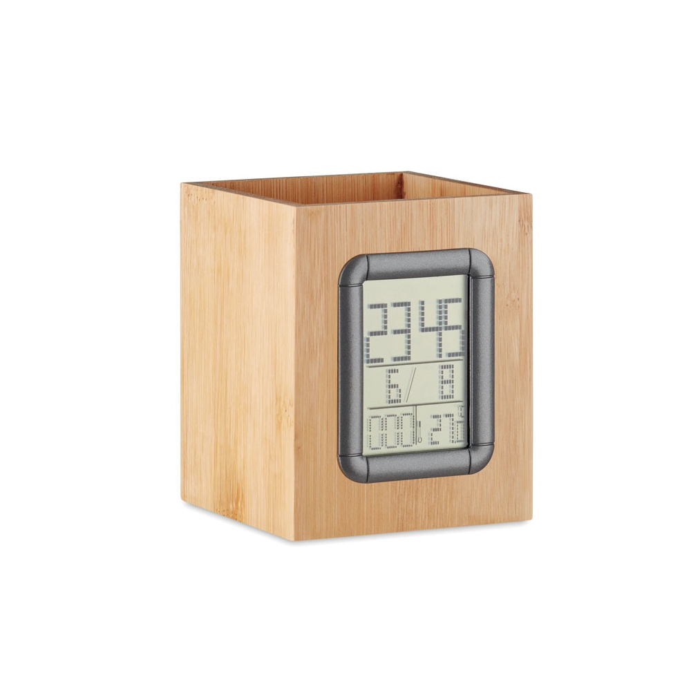 Artikel-Nr: OCBMO6289-40Stiftehalter aus Bambus mit Zeit-, Alarm-, Kalender- und Temperaturanzeige. Inkl. 2 Knopfzellbatterien. Bambus ist ein natürliches Produkt, es kann daher zu leichten Abweichungen in Farbe, Dekor und Maßen kommen.
